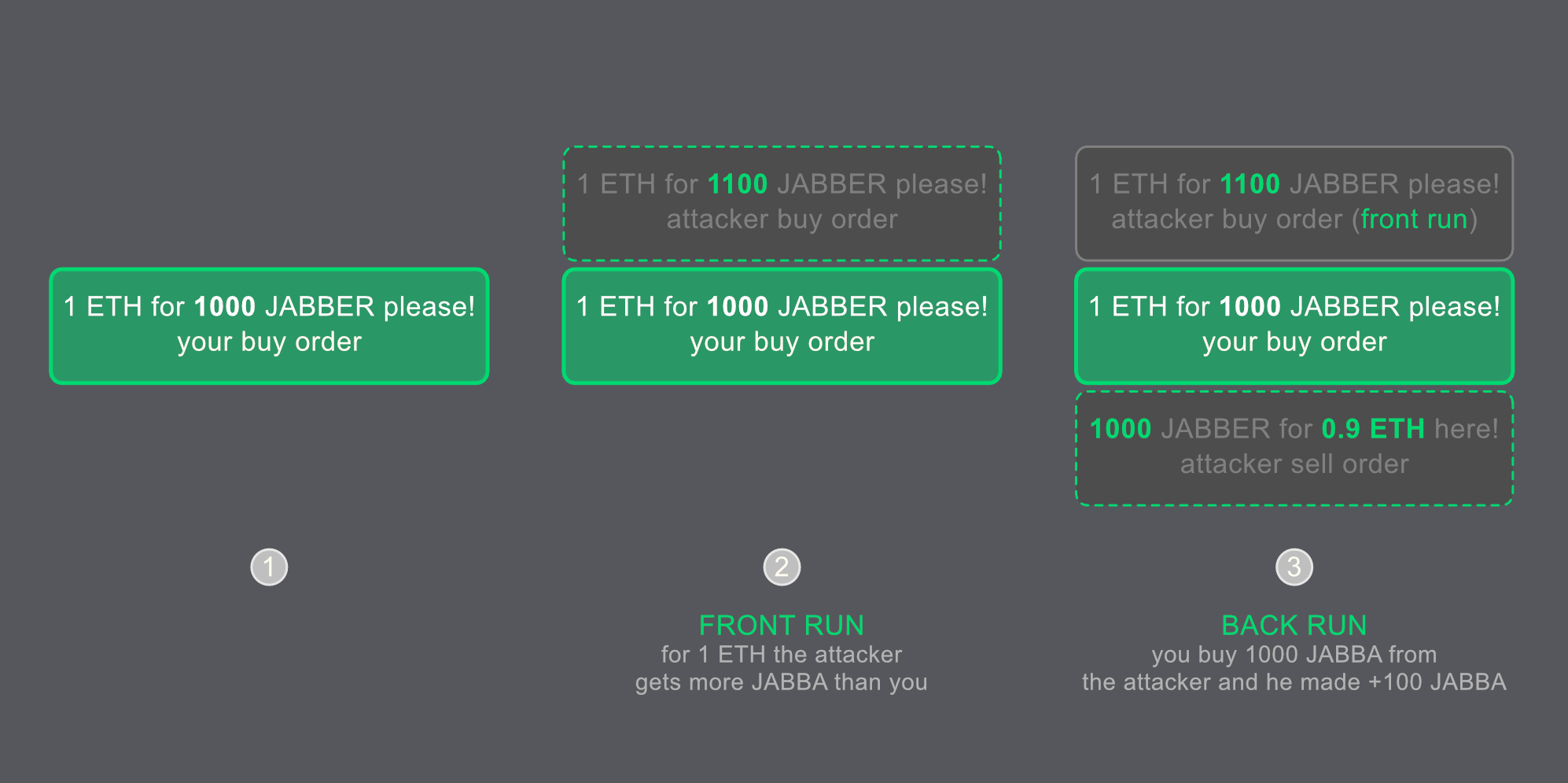 The attacker runs a bot that watches your transaction in the Ethereum mempool. The bot knows that the token price will increase with your JABBA buy order and sends a transaction that front runs your transaction. The attacker's transaction also buys $JABBA tokens for LESS (or more tokens for the same amount of ETH). Right after your transaction, the bot sends a second transaction (gosh, he back-runs you, too!!!) and sells the JABBA token again for a HIGHER (sells less amount of JABBER tokens and gains the difference) price.