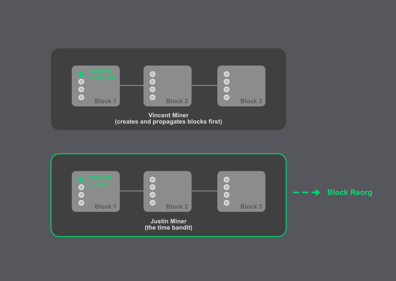 Let's imagine Vincent, a miner, has created the last three blocks and propagated those to the entire network. Justin, the time bandit, saw a shiny 100 ETH of a decentralized exchange (DEX) arbitrage which should go to Amanda. Vincent and Justin are usually happy with the block rewards, but this time Justin puts on his greedy bandit mask and wants to catch the 100 ETH for himself. He re-mines block one to three and changes the one transaction for his favour. Because of the "longest chain rule," the blocks are reorganized to favour Justin's manipulated transaction. Justin rewrote history!