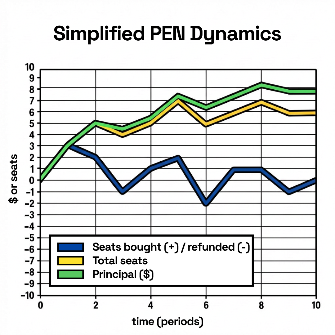The interplay between these purchases, resignations and reclamations gives the PEN a wonderful anti-fragile property. Seat refunds and reclamations may cause the seat price to move to a lower tranche and always leaves the PEN more well capitalized per member. This creates two structural feedback loops that dampen negative dynamics and prevent reflexive collapse. Departures benefit members who stay, preventing further departures. Departures make new seat purchases more attractive for both new and existing members, spurring new growth.