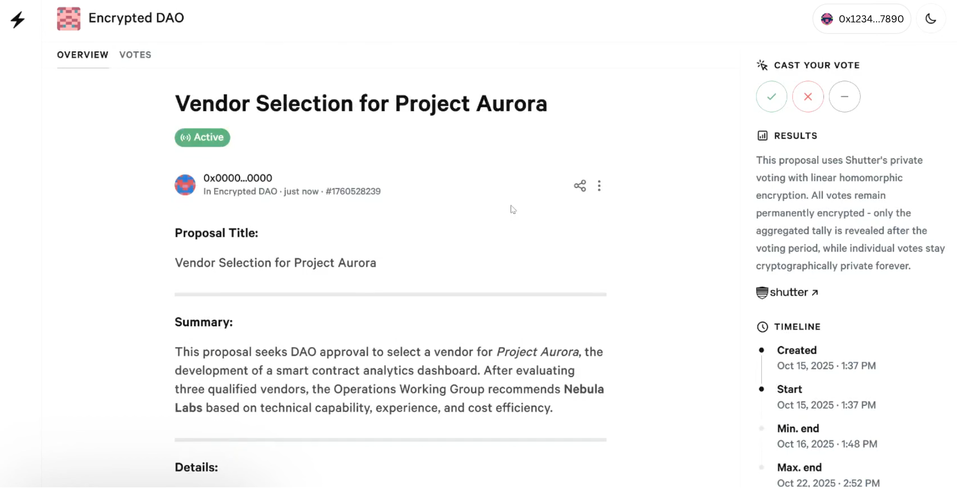 In this PoC, users can cast yes/no votes privately using Shutter’s El-Gamal-based system. Multi-choice and other advanced voting types are also possible by splitting them into multiple binary sub-votes.