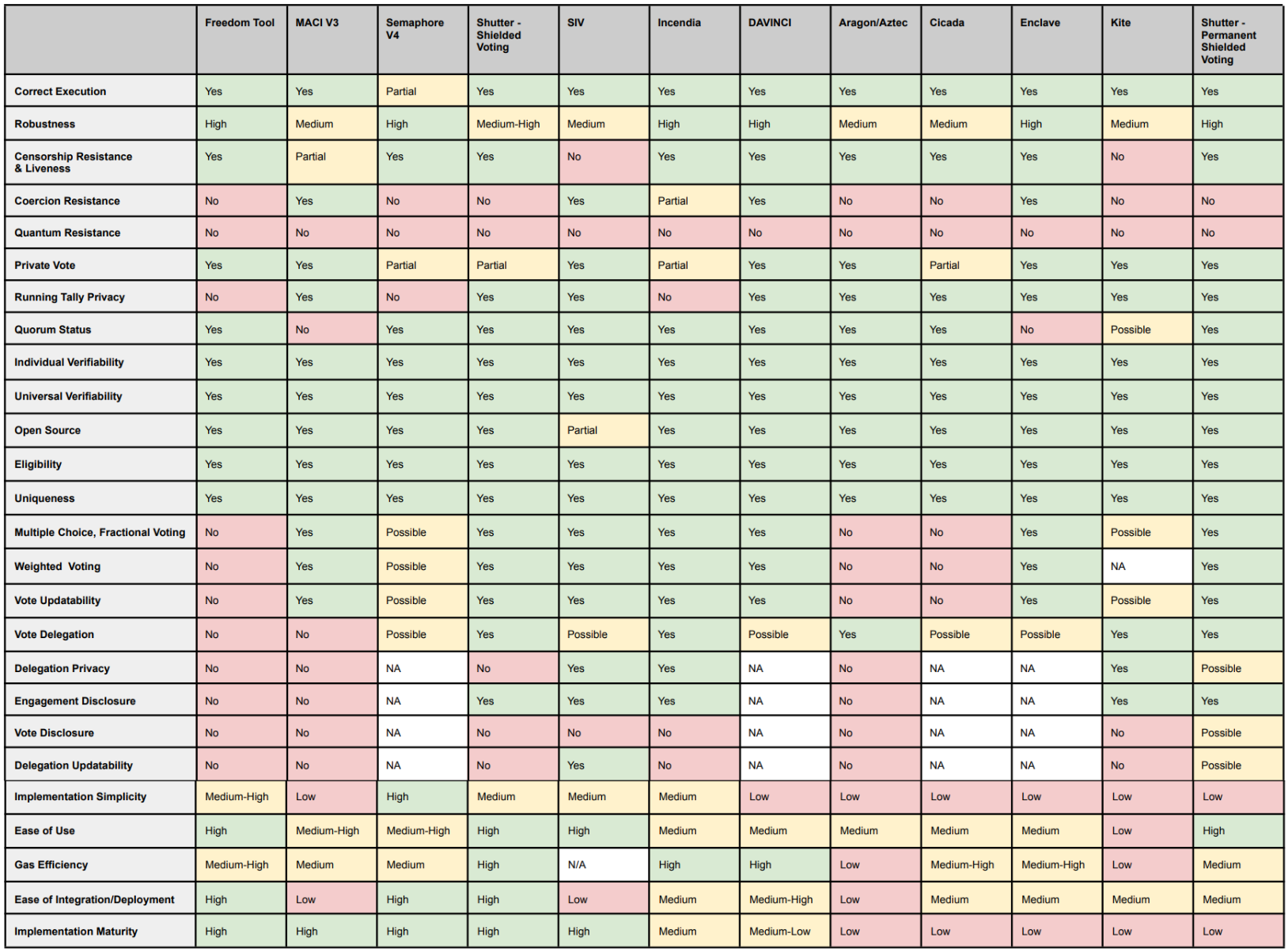- Analysis of Private Voting Protocols: A structured evaluation of leading projects across key dimensions - Integrity & Correctness, Privacy, Verifiability, Voter Authentication & Integrity, Voting Methods, Flexibility, Delegation & Representation, and Practical Considerations.