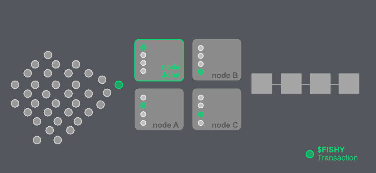 As soon as I submit the transaction, including 100 $FISHY tokens and a gas fee of 0.1 ETH (That's pricey 🤑, I know. I want the $JABBA tokens so badly!), my browser wallet sends the transaction to a server which is connected to my wallet. This server (a node) broadcasts all the incoming transactions of wallets connected to the blockchain network. John's miner nodes are now also aware of the $FISHY tokens. He wants to catch this transaction and front run it!